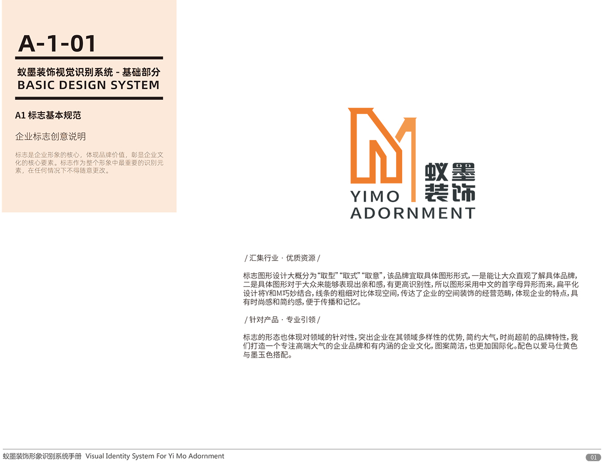 品牌介紹 :蘇州蟻墨裝飾工程有限公司經營范圍包括室內外裝飾裝潢工程、建筑工程、幕墻工程、園林綠化工程、樓宇智能化工程的設計與施工;管道、門窗、水電安裝;銷售:建筑材料、金屬材料、五金交電。LOGO設計,選用“YIMO”的首字母“Y,M”進行圖形創意,設計簡潔、配色以愛馬仕黃色與墨玉色搭配,偏平話設計講字母巧妙的組合在一起,通過線條的粗細突出層次感和空間感,傳達了企業的空間裝飾理念,易于傳播與記憶。