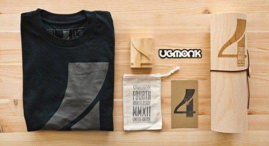 Ugmonk為慶祝其品牌成立四周年特別推出了限量款的t恤,200件100%純棉的黑色t恤被精心包裹在一個由白樺木皮制作的圓筒內,外側用激光雕刻出4周年的字符。包裝內還附贈了一個由回收銀杏木制作的紀念印章,一張帶有設計師親筆簽名和手工加蓋的卡片。