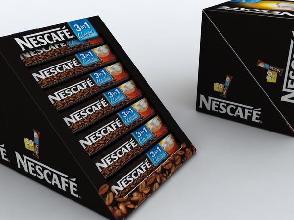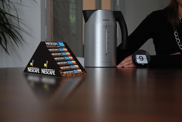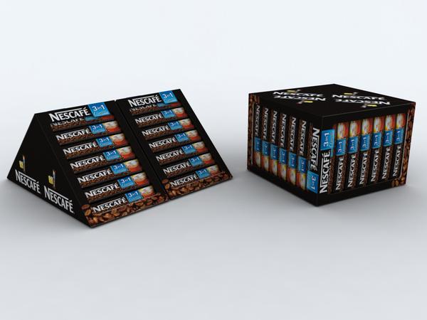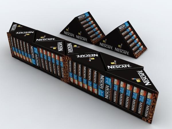 Nescafé雀巢三合一棒包裝設計,設計為擺放50件雀巢三合一棒的一個新包裝,它能放置在商店柜臺旁,家里的廚房,會議期間的桌面上等等。如果你把箱沿其對角線,你就會得到兩個三角部分。每一個部分可以擺放25支。三合一棒在框中,可以穩(wěn)定地保持亦可容易取出。框的設計可以折疊,沒有任何膠結。