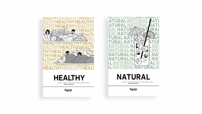 西格輕食以加粗的品牌名作為LOGO,更契合輕食“輕”的主題。整體風格簡單清新明快,配色上采用了大量簡筆線條和留白,配上許些低飽和度的顏色,更易于突顯食材的艷麗,為店鋪帶來了爽朗活潑的氛圍。