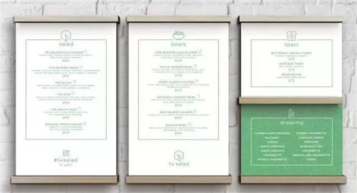輕食不僅注重食物原本的味覺,并且將心化的概念作為主要的核心。與追求佐料帶來的味覺爽快不同的是,輕食以健康、養(yǎng)生、內(nèi)化作為新的飲食方式。目前來說,大部分輕食餐飲店為了突出輕食健康便捷的特點,都會在VI和空間上采用簡約圖形、低飽和配色和大部分留白來突顯其輕食屬性,這樣的視覺設計在讓食客感到輕松愉悅的同時,更能突顯出輕食艷麗誘人的色彩,為盤中營養(yǎng)但卻可能過于寡淡的美食增添許些“風味”。