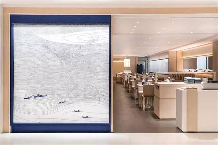 說起日式風(fēng),肯定少不了日料店。這家日料餐廳,以日本傳統(tǒng)花紋樣式青海波為品牌主要視覺元素,通過靛藍(lán)色和白色混搭的青海波圖案,呈現(xiàn)出自由開放的樣貌。簡約流動的線條,與插圖結(jié)合,頗有意趣。不僅將日本民間文藝元素進(jìn)行圖形化展示,也是餐廳提供新鮮食材的一種比喻性表現(xiàn)。餐廳的LOGO以一個簡化的圓形米飯碗樣式進(jìn)行呈現(xiàn),圖形居中,文字進(jìn)行環(huán)繞,簡約中又有立體突出的效果。