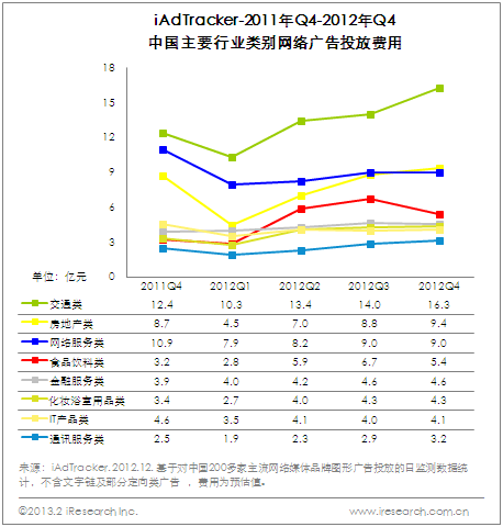 媒體類別方面,2012Q4是門戶網站廣告收入占比自2011Q2下降以來的首次上升,媒體類別間的市場格局更為撲朔迷離。另外,房產網站廣告收入基本進入平臺期,穩定仍是大方向;視頻網站逐步受到廣告主青睞,2011-2012每季度投放費用上升明顯。