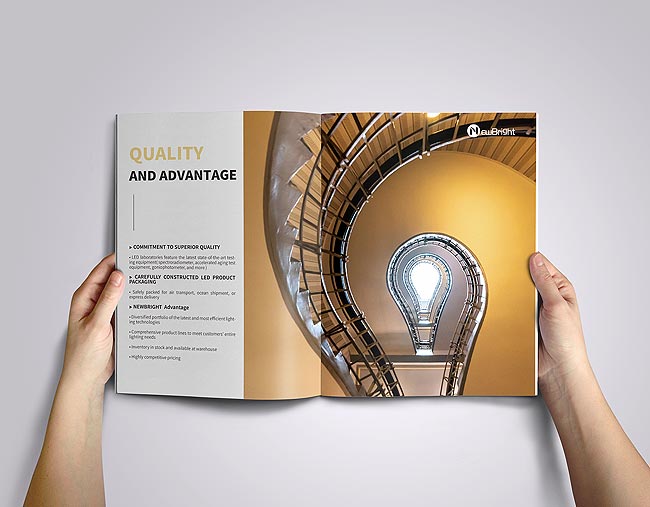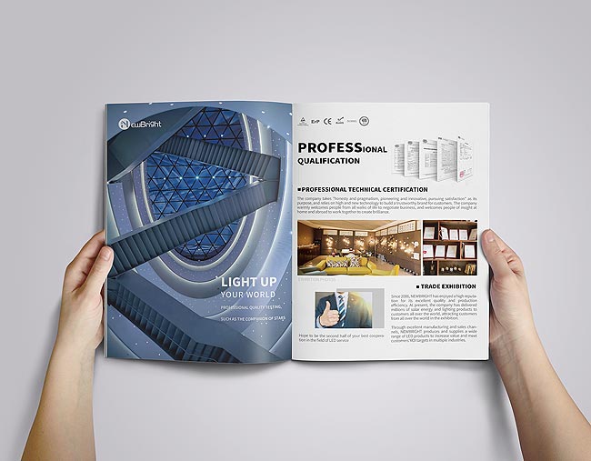 照明產(chǎn)品直接在封面展示嗎?這種設(shè)計方法并非總是管用。企業(yè)進入品牌塑造階段以后更多的是讓用戶記住你這個品牌,進而逐步通過產(chǎn)品來積累信任度。因此封面上不必面面俱到羅列照明產(chǎn)品,后續(xù)內(nèi)文有足夠的空間給與設(shè)計師充分的發(fā)揮。照明產(chǎn)品宣傳冊封面以簡潔的風(fēng)格,讓LOGO優(yōu)先進入用戶的視野,并且在色彩上進一步統(tǒng)一協(xié)調(diào),如果需要圖片素材配合,可以設(shè)計一張富有意境的家居環(huán)境照片,從而使得整本產(chǎn)品宣傳冊更富有想象的空間。