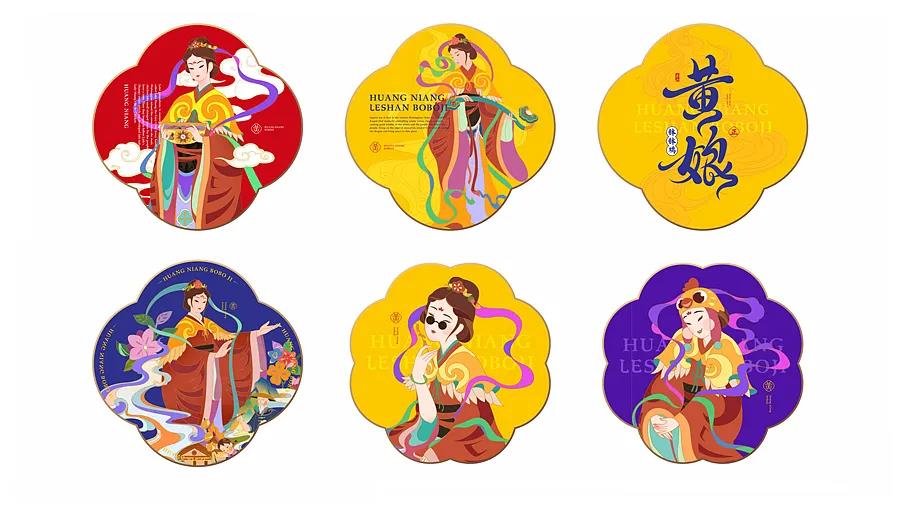 輔助圖形依據于神話傳說中出現的生物和場景,引起禍亂的蛟龍,黃娘下凡降龍、洪水淹沒村莊、黃娘做湯、黃娘藏寶、黃娘缽缽雞,每一幅圖形都惟妙惟肖,燙金的畫質令輔助圖形看起來貴氣不少。接而是根據神話傳說打造出黃娘的IP形象,傳說里黃娘身披五彩錦繡,故而繪制了仙氣十足的綢緞,如敦煌壁畫中的飛天神女所披著的飄逸絲綢緞,強調神女這一身份,讓神話為品牌添上神秘性。黃娘眉目如畫,美目流盼、桃腮帶笑,氣質斐然,頭上的裝飾由辣椒、豌豆和仙草等元素美化而成,釵鳳將頭發高高盤起,綢緞在身邊環繞,黃衣讓黃娘多了一絲嬌俏的韻味。