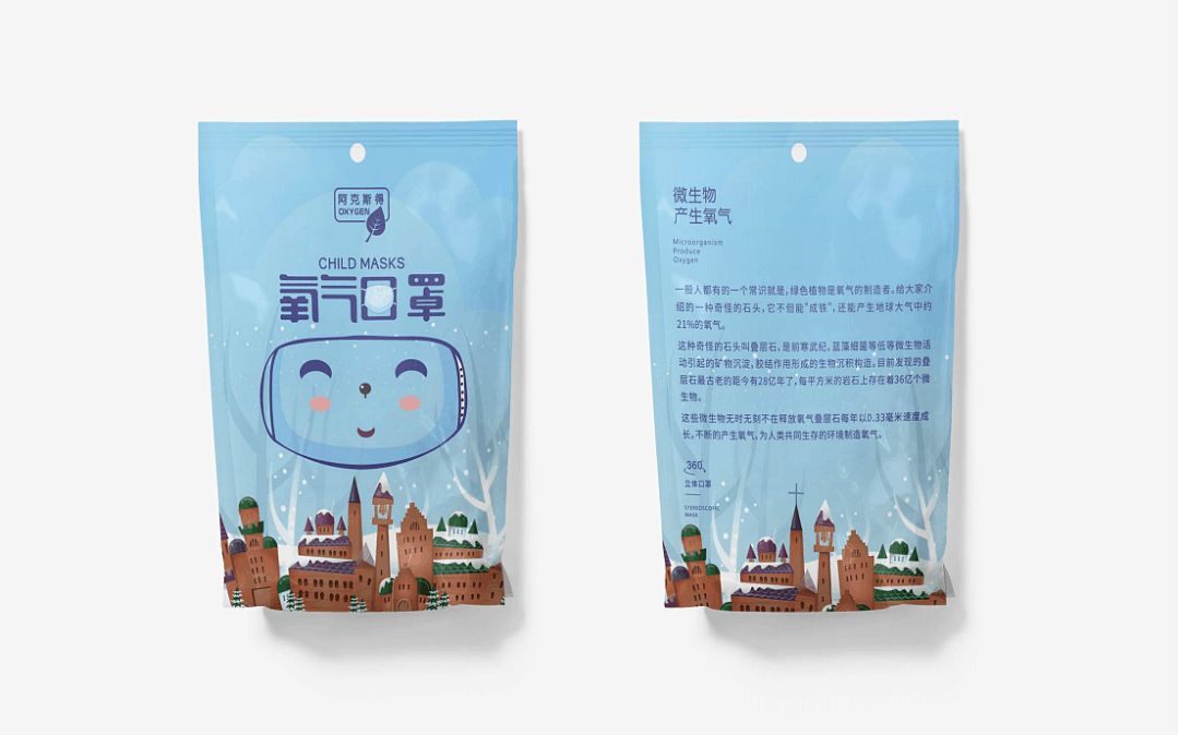 冬季飄雪的故事性場(chǎng)景插畫設(shè)計(jì),配以歐洲風(fēng)情的城堡元素,口罩包裝也更加唯美動(dòng)人,包裝中央的笑臉設(shè)計(jì),仔細(xì)一看其實(shí)是口罩的輪廓形象,暗藏玄機(jī)的IP描繪卻也親和感十足。