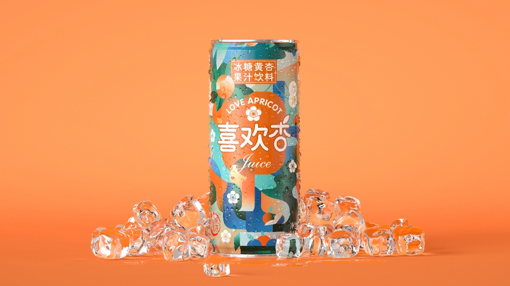 包裝設計中插畫用現代手段把杏林產區描繪得時尚浪漫。在冷色調整體布局中穿插溫暖黃杏,以冷暖色的結合突出杏汁的酸甜口感,形成印象深刻的清新質感。