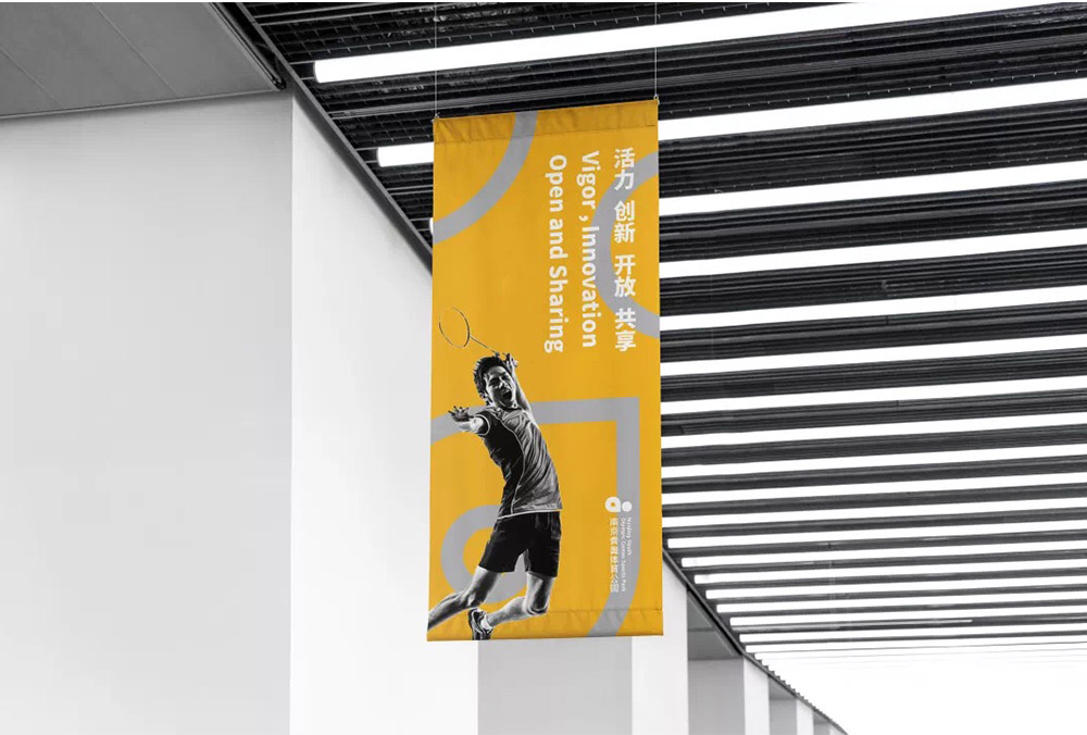 LOGO主色調采用充滿朝氣的橙色和沉穩大方的灰色。橙色代表活力體育,灰色代表開放共享,表現了場館宜靜宜動的多重屬性,同時也展現出文體產業發展與互聯網智慧化相融合的創新理念。