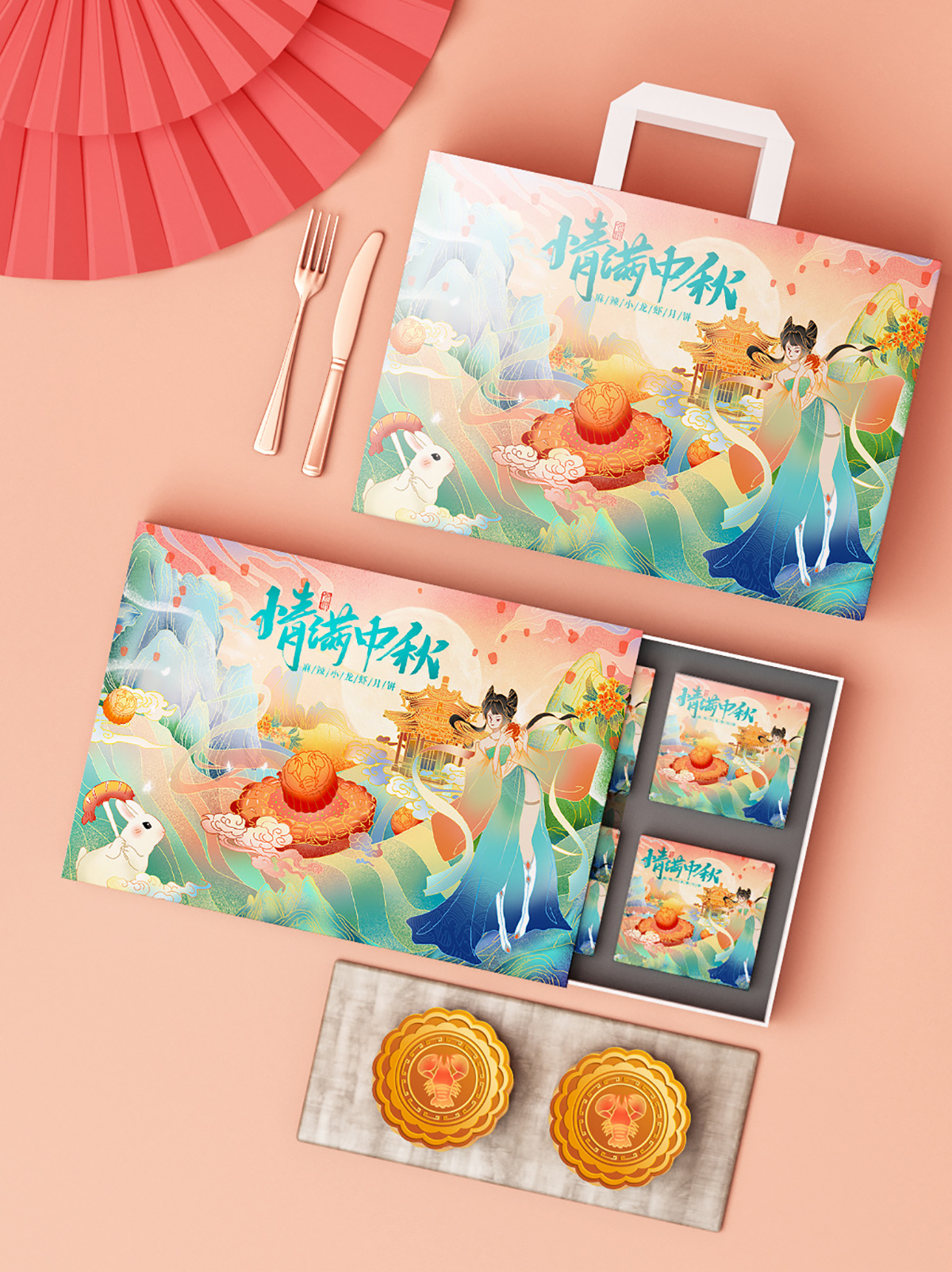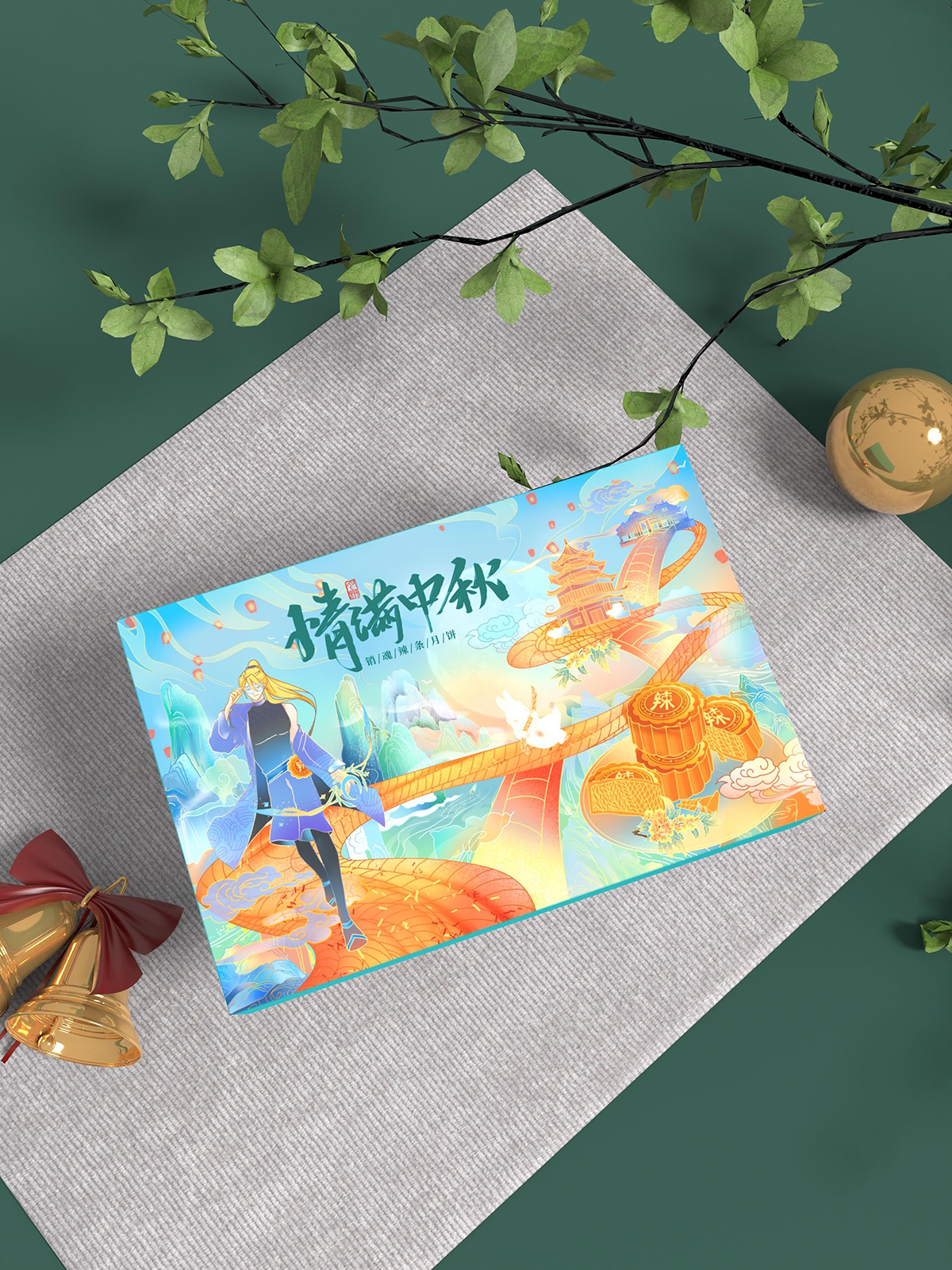 禮盒以“月宮綺夢”為主題,將嫦娥的柔美與月宮的神秘融入設計。插畫主體聚焦嫦娥翩躚舞袖的瞬間,衣袂飄飛如云,身后是皎潔明月、玲瓏玉兔與繚繞的桂樹影,營造出如夢似幻的仙境氛圍。畫面既保留古典神話的韻味,又通過現代插畫技法增添靈動與層次感,呼應中秋的浪漫與哲思。