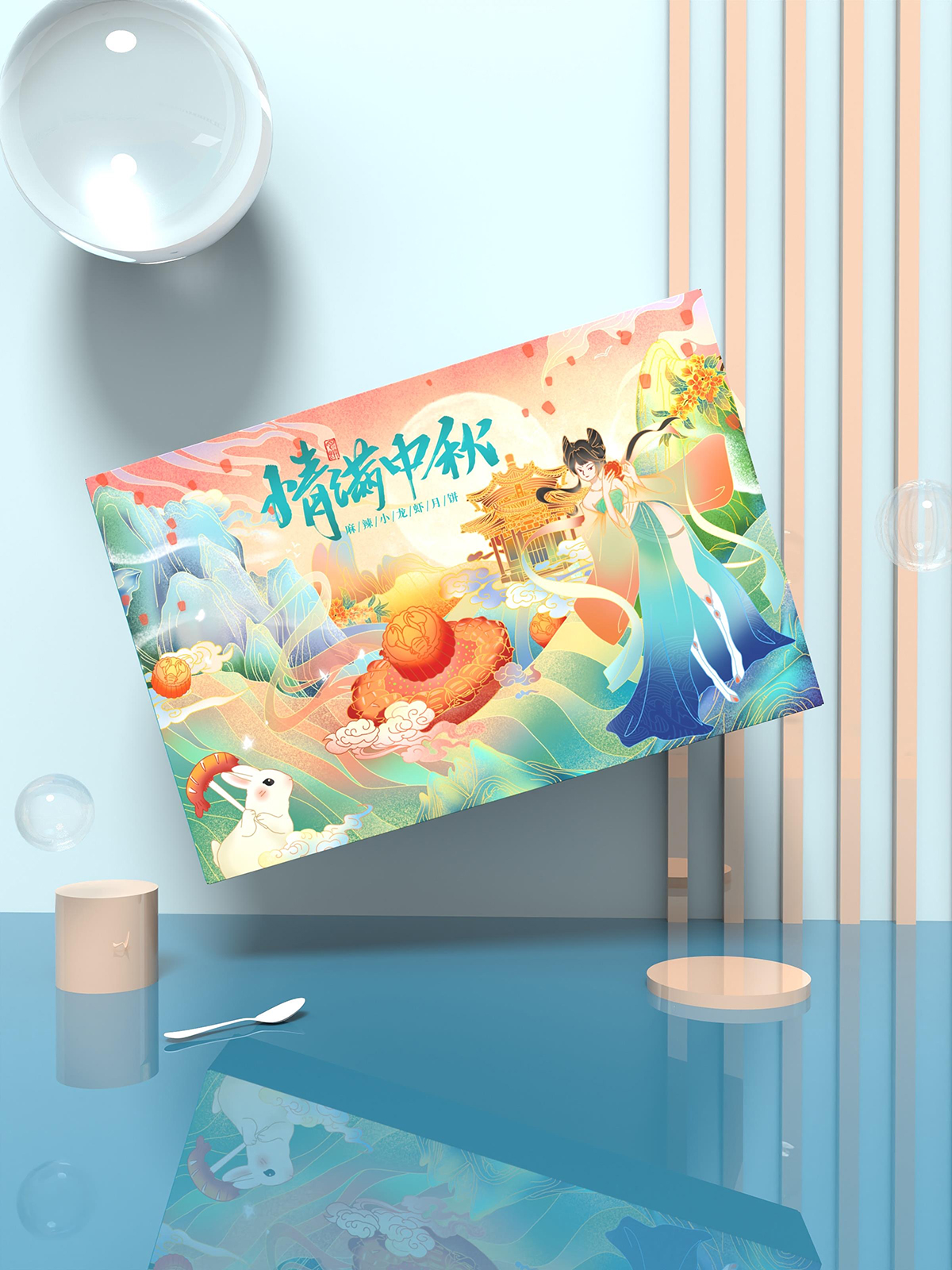 月宮元素:桂樹枝葉蜿蜒成邊框,玉兔藏身云間若隱若現,增添探索趣味;遠山與星河層疊,構建縱深空間感。