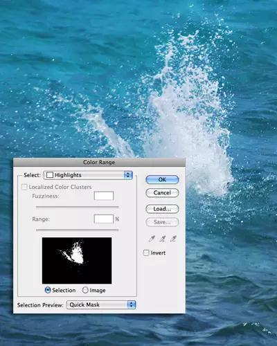 選擇> 顏色范圍,利用顏色拾取器單擊對象。在這個例子中,我單擊的是水浪的白色區(qū)域。