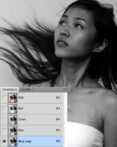 點擊每一個圖層,找出圖層背景和頭發(fā)部分顏色差異最大的圖層。然后,復制該圖層。