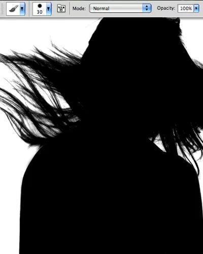 接著,使用一個黑色的畫筆補全模特身體的其他部分,白色畫筆用于描繪背景中的暗色區(qū)域。