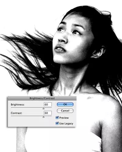 選擇被復制的圖層,點擊圖像>調(diào)整>亮度/對比度,在不減少發(fā)絲的前提下,盡可能地調(diào)高亮度和對比度。理想狀態(tài)下,可以將背景調(diào)成純白色,而頭發(fā)為純黑色。