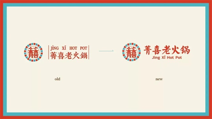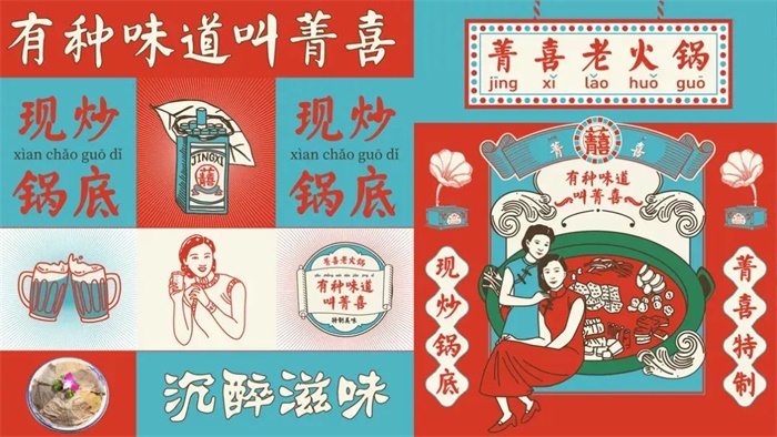 菁喜火鍋新的LOGO設計打破了舊式標志古板、規整的框線,將字體放大化并作為主視覺,采用了民國風的顏色、插畫以及版式,和低飽和度的紅、灰、藍色調,突顯出該品牌的特色,運用了對稱的版式設計,結合新民國風的人物插畫形象,使民國風更加鮮明。利用對稱連續的紋樣,加以線條豐富其設計形式,延續了品牌的復古民國風調性,喇叭留聲機、紙盒飲料生動還原了新民國時期的生活氣息。放射線的復古底版設計,搭配新鮮豐盛的食物,突顯了視覺印象,使畫面飽含跳躍感,加深了消費者對產品的印象。