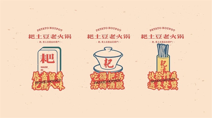 這家叫耙土豆老火鍋的火鍋品牌以土豆作為主角,打出“耙,是土豆最后的尊嚴!”的口號,告訴人們土豆就該“耙”著吃。這套VI視覺設計是土豆、麻將、懷舊玩具等元素的集結,充滿市井的感覺。顏色搭配上,以番茄紅為背景色,搭配土豆色的字體,既有扁平硬朗的字體樣式,也有菱角分明的字體。