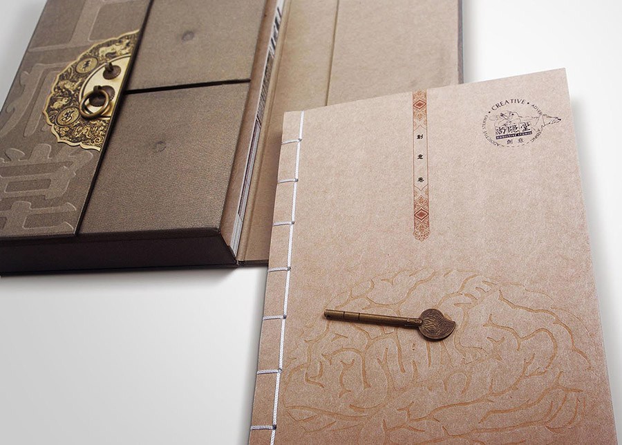 這是一套作品集,作品集正面為大門狀設計,正中裝有銅門扣,意為打開智慧之門,打開后即可看到有擊凸于封面上的大腦。這套書的裝訂方式為古線裝,既體現了古人裝訂技術,又體現了今人的智慧。