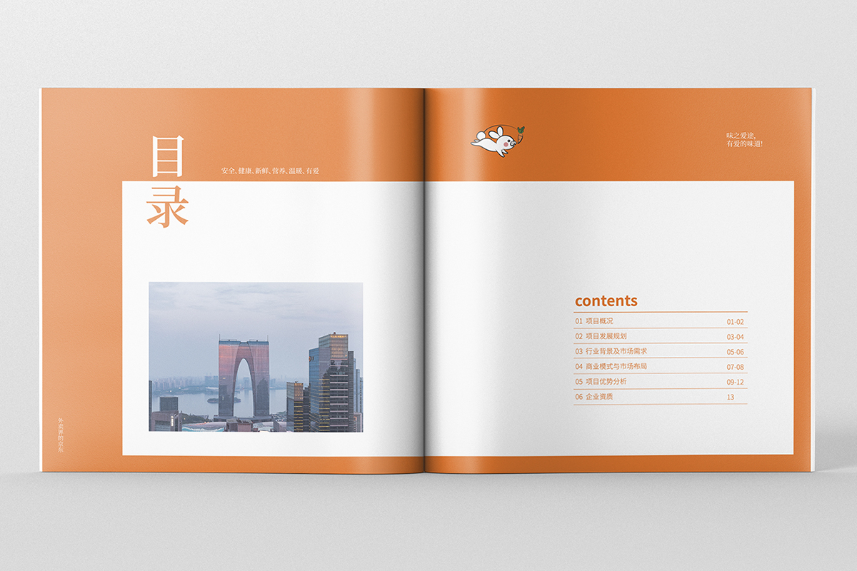 本案例是為餐飲平臺的招商宣傳冊設計。品牌理念主打“安全、健康、新鮮、營養、溫暖、有愛”品牌餐廳家常菜系,提前預定,當天制作,保證足量與菜品新鮮,突破地域限制,以創業園、寫字樓等為集中消費區,實現全城專屬定向配送,解決消費者午、晚健康營養的兩餐問題,同時把愛與溫暖送給為理想奮斗的人們。所以在畫冊宣傳中,不需要華麗、復雜的設計,只需要將產品圖片很好地表現出來,所謂眼見為實,讓人們能看到實物圖片,是最具有說服力的設計。
