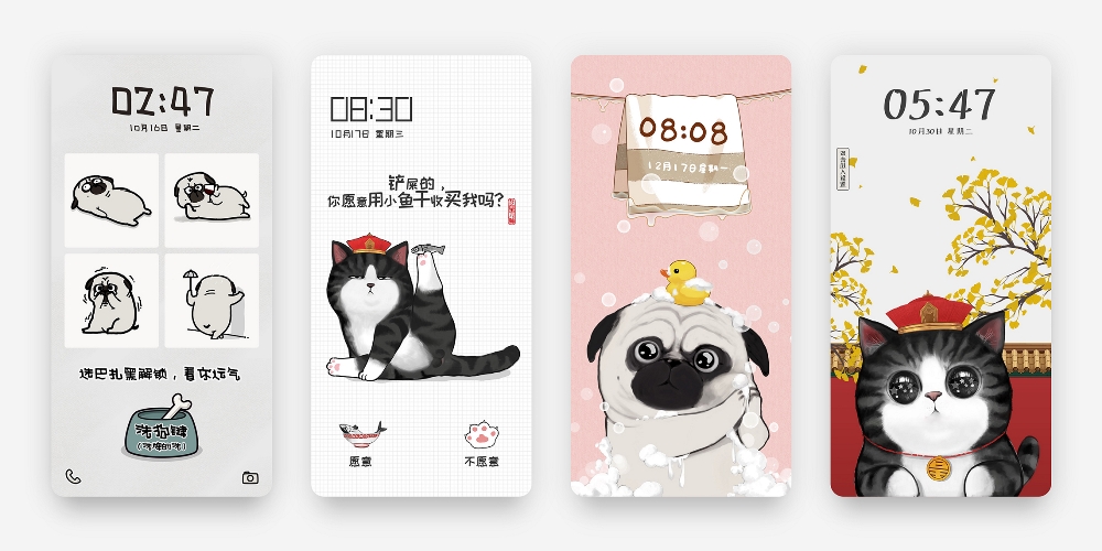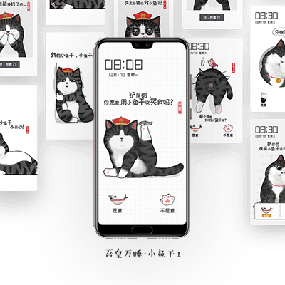 手機主題有趣的地方就在于,不同于靜態的壁紙,主題是動態且可以交互的!缎◆~干》的沉浸式交互設計,受到粉絲的一致好評。這款主題以喂吾皇小魚干的第一人稱視角,讓用戶主動選擇喂或不喂,打造了一次新奇的互動旅程。如果用戶選擇不同意喂小魚干,吾皇就傲嬌黑屏,讓你沒有一點防備。若用戶選擇同意,吾皇會人性化引導用戶不斷地摸蛋蛋去掙錢,讓手機屏幕也能體驗一把闖關游戲的樂趣。